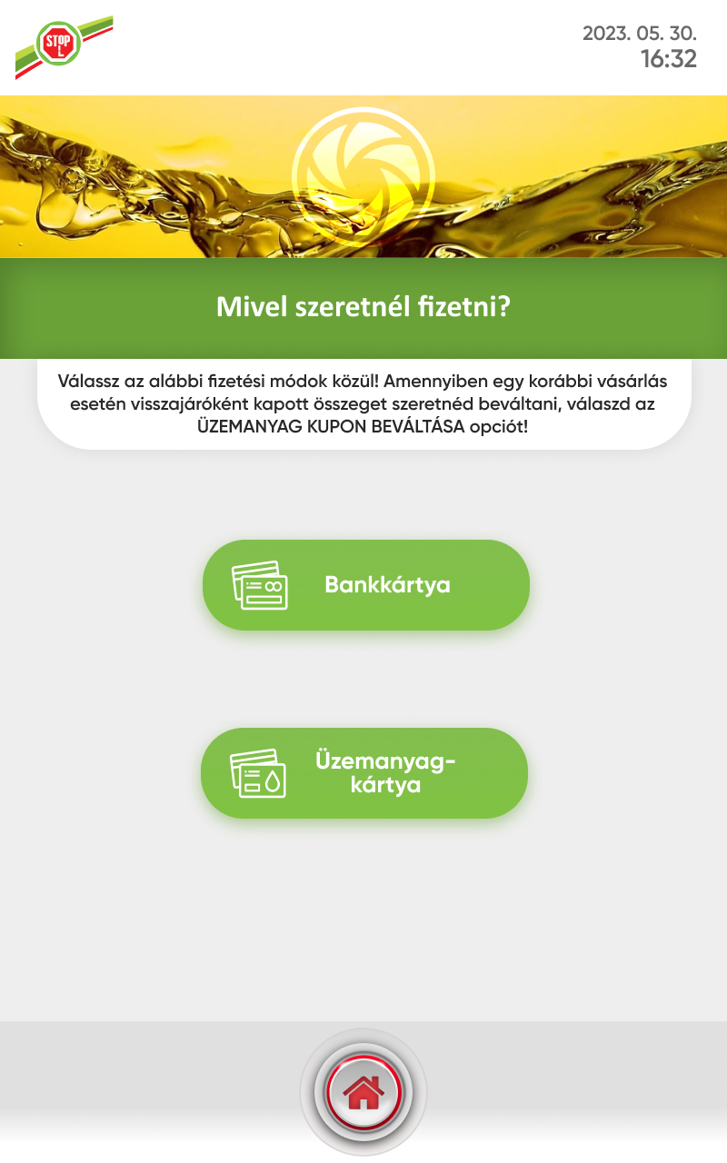 Add meg milyen módon szeretnél fizetni az üzemanyagért a megfelelő gomb megérintésével. Bankkártyás vásárlás esetén a folyamat elején megadott összeget zárolja a rendszer, de csak a valóban letankolt mennyiséget vonja majd le a folyamat végén. Készpénzes vásárlásoknál szintén a letankolt mennyiségnek megfelelően ad vissza az automata a tankolást követően.