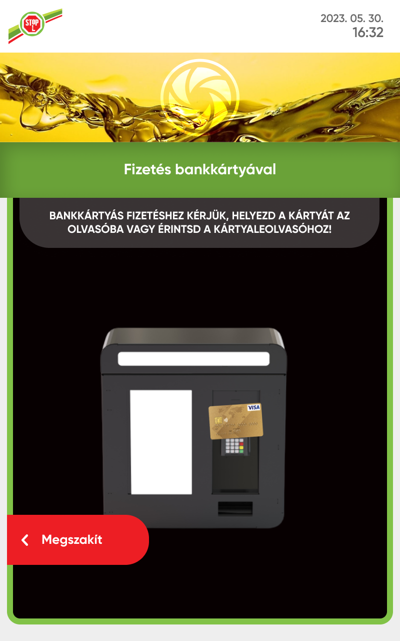 A folyamatot a beállított összeg letankolásakor automatikusan lezárja a rendszer. Ha az előre megadottnál kevesebb üzemanyagot szeretnél vásárolni helyezd vissza a pisztolyt a kútoszlopra, amikor az autód üzemanyagtartálya eléri a kívánt szintet. A tankolási folyamatot így tudod megszakítani.