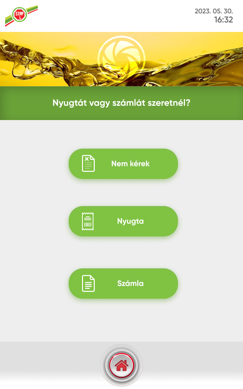 Számla igénylésére a tankolás megkezdése előtt, közvetlenül a készpénz behelyezése, vagy a bankkártyás fizetés után van lehetőséged. A fizetést követően automatikusan megjelenik egy felület a kijelzőn, mely segítségével bizonylattípust választhatsz. Ha számlát szeretnél igényelni, válaszd a Számla opciót, majd add meg vállalkozásod adószámát, mely alapján rendszerünk automatikusan kitölti a számlán feltüntetendő adatokat, ha szerepel a szám az adatbázisunkban. Ha rendszerünk nem ismeri fel automatikusan a megadott adószámot, a számla kiállításához kérjük add meg vállalkozásod adatait az automata érintőképernyőjén.