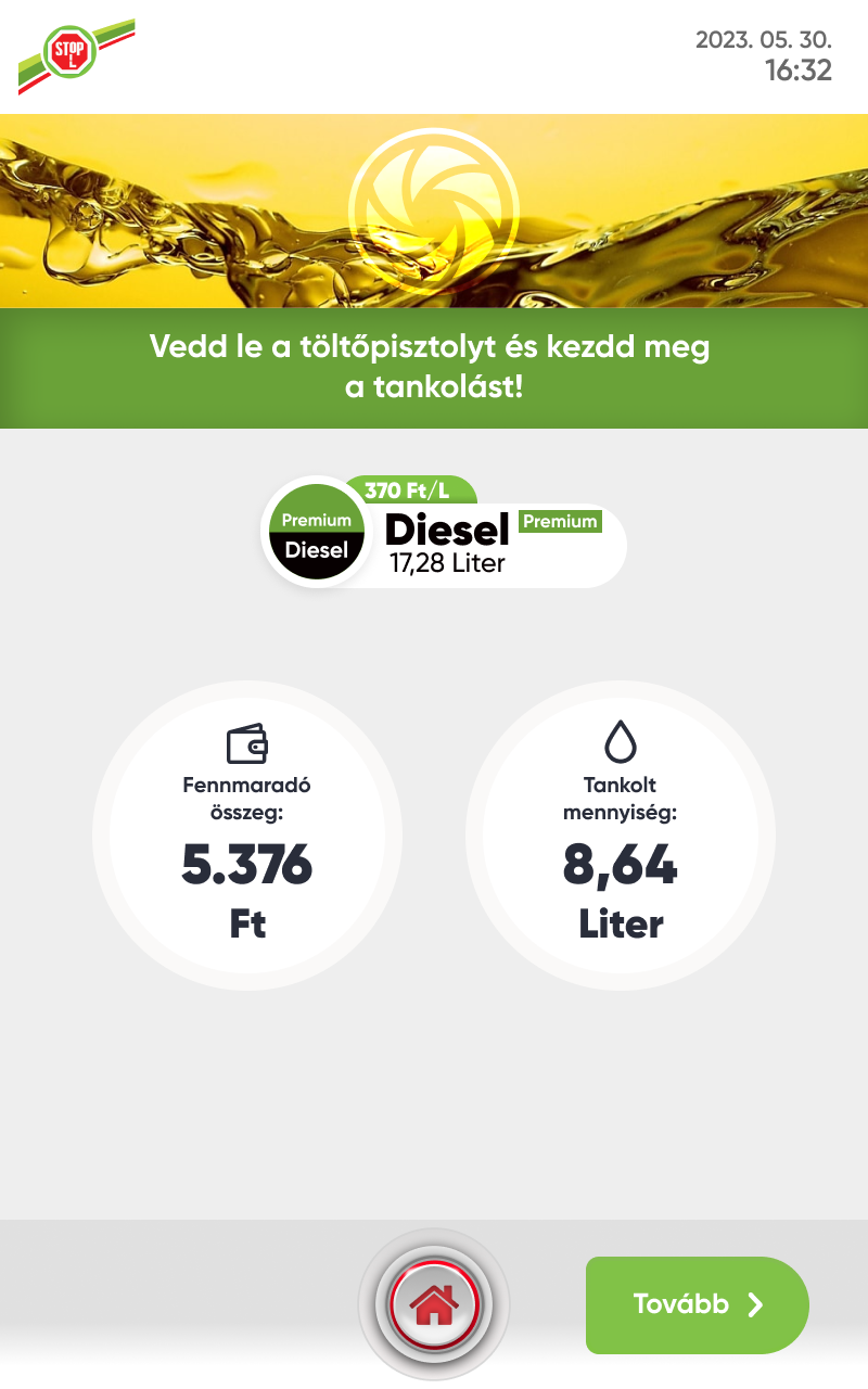 Kérjük figyelj rá, hogy annál a kútfejnél kezd meg a tankolást, amit korábban kiválasztottál az automata felületén. A tankolást a pisztoly levételével indíthatod el. A rendszer folyamatosan kommunikál a kútfejjel és egy indikátor segítségével jelzi a tankolás aktuális állapotát, azaz a tankolt mennyiséget és a fennmaradt összeget.